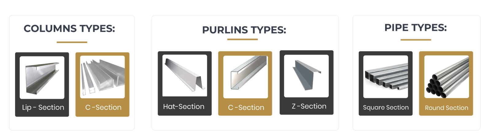 C-Sections (Column, Rafter, Bracings), Hat-Section (Purlin).